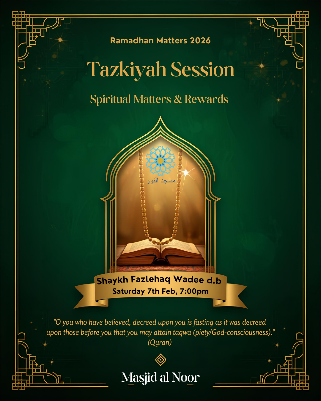 Masjid al Noor Lancaster. Tazkiya – Ramadhan Matters 2026 As part of our Ramadhan Matters 2026 series, Shaykh Fazlehaq Wadee d.b. delivered a beautiful and inspiring reminder on preparing for Ramadhan with sincerity…