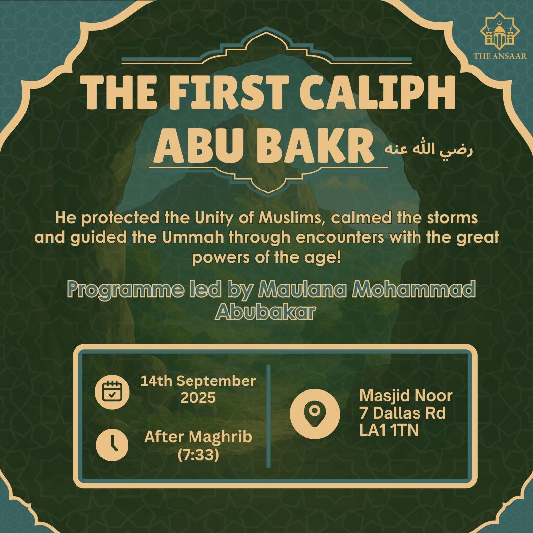 Masjid al Noor Lancaster. In the Shade of al-Ṣiddīq | فِي رِحَابِ الصِّدِّيقِ A powerful reflection on the life and legacy of Abū Bakr al-Ṣiddīq رضي الله عنه — the one who united hearts, steadied the Ummah in times of…
