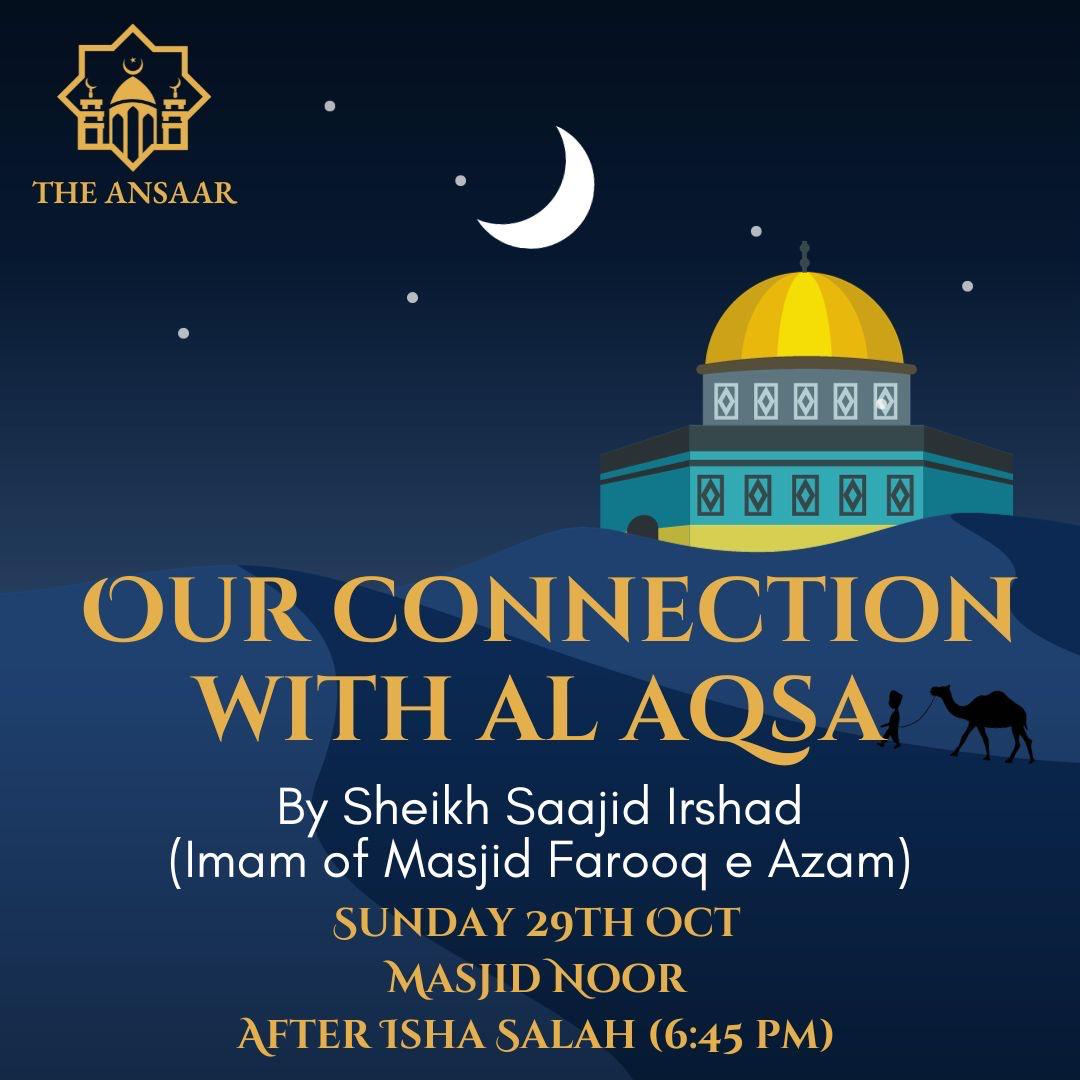 Masjid al Noor Lancaster. Our Connection With Aqsa A beneficial evening of reminders with Shaykh Sajid Irshad (Farooq e Azam) on the deep connection of the Ummah to the Holy Land. A reflective gathering at Masjid al…