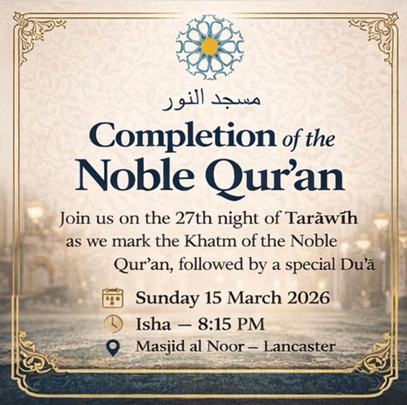 27th Ramadhan 2026 A heartfelt and soul-stirring night with Shaykh Mushtaq, marking Laylat al-Qadr, the completion of the recitation of the Noble Qur’an, and a sincere turning to Allah in duʿā for forgiveness, mercy…
