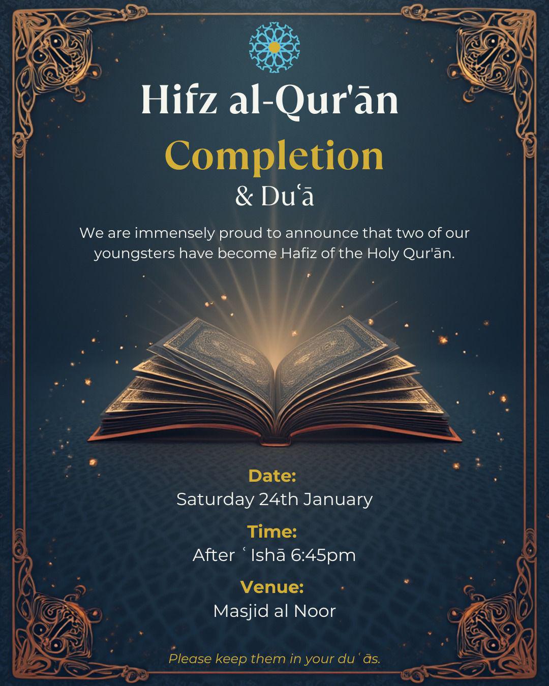 Masjid al Noor Lancaster. Qur’an Completion, Reminders and Duʿās A joyful and uplifting gathering at Masjid al Noor as two of our students completed ḥifẓ and were presented with their certificates. The evening also…